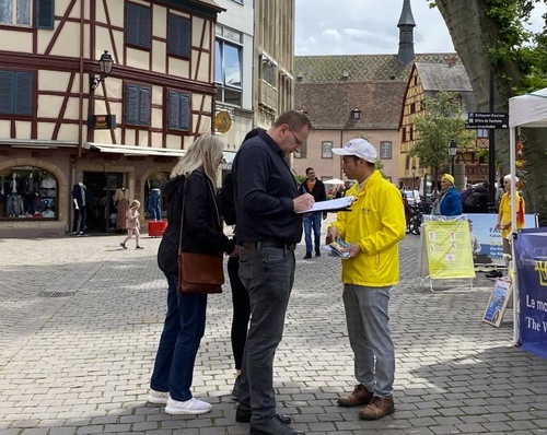 A Falun Gong information day event was held in the center of Colmar on May 24. Colmar is the third-largest city in the Alsace region. It has a rich architectural heritage and canals that have earned it the reputation as a “Little Venice.” There are also houses that date back to the Middle Ages.