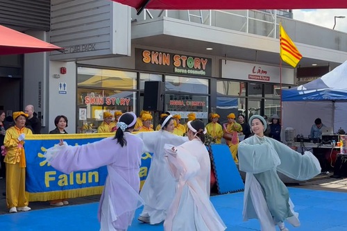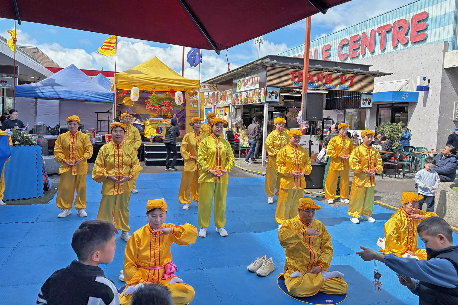 (Minghui.org) The Vietnamese Community Association held a Mid-Autumn Festival celebration in the Springvale suburb of Melbourne, Australia on September 20, 2025. Falun Dafa (Falun Gong) practitioners were invited to participate. They demonstrated the exercises, performed the waist drums, and did a Vietnamese folk dance. Their booth drew many residents and tourists who learned about Falun Dafa.