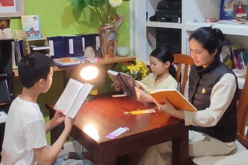 Thi Phuong Thanh Nguyen and her son and daughter read Zhuan Falun.