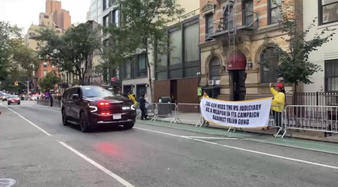 President Trump and his entourage saw practitioners holding banners while departing the UN Headquarters. The President waved at practitioners.