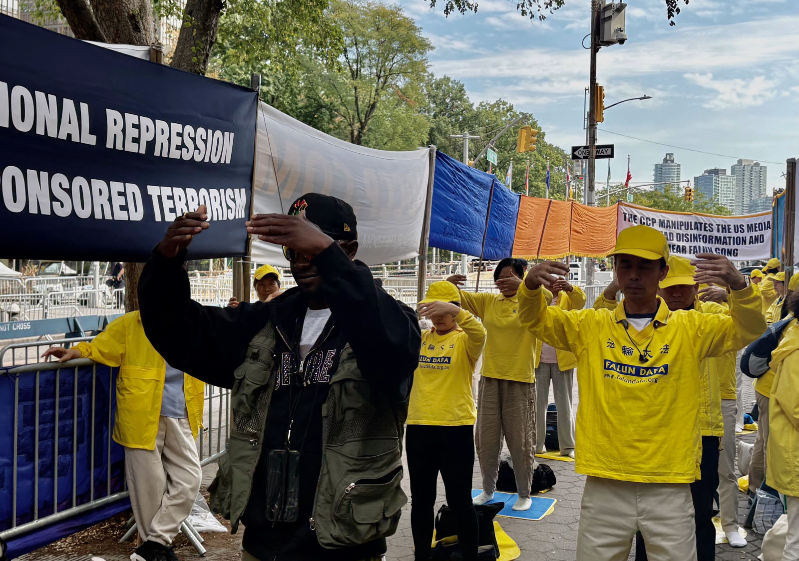 (Minghui.org) The 80th United Nations General Assembly was held at the United Nations Headquarters in Manhattan, New York on September 23, 2025. Falun Gong practitioners gathered at Dag Hammarskjold Plaza that morning to do the exercises and peacefully protest to raise awareness of the Chinese Communist Party’s (CCP) ongoing persecution.