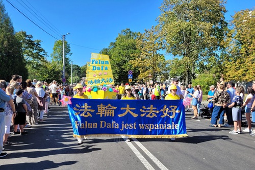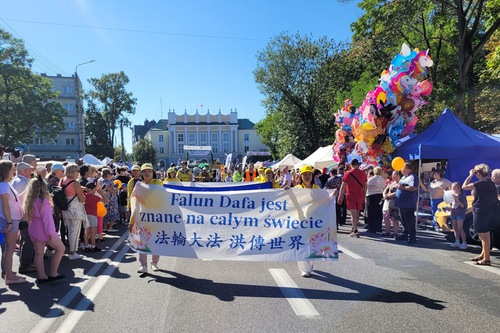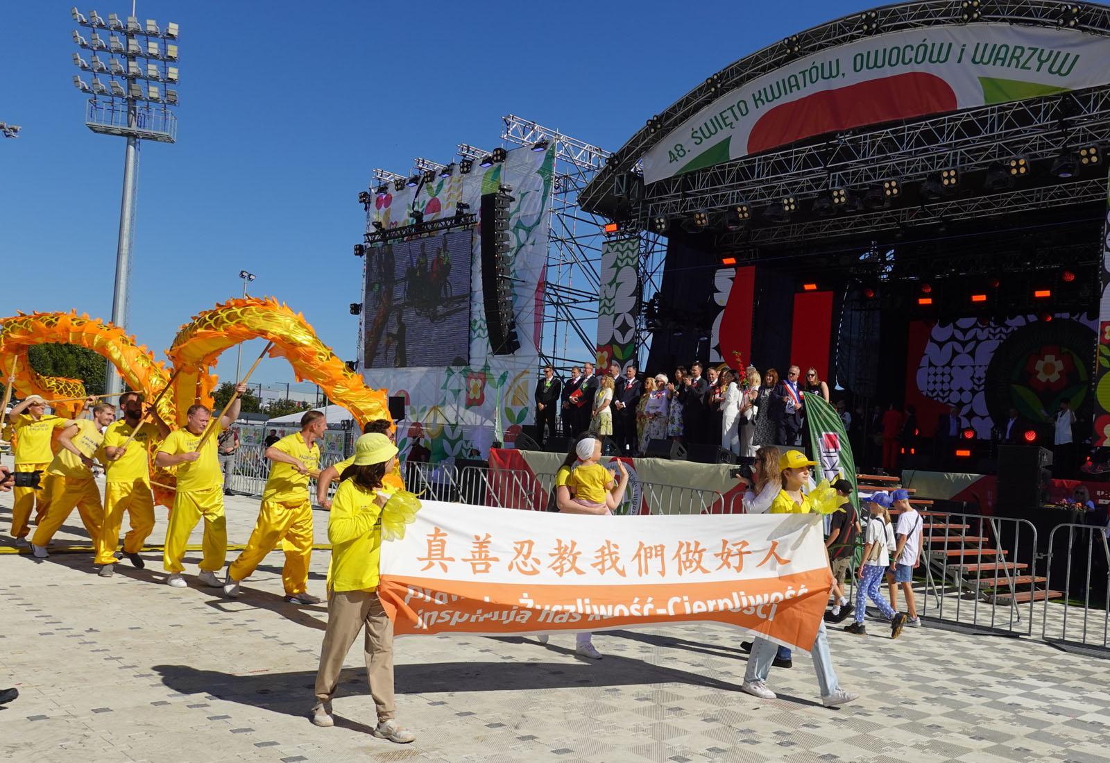 (Minghui.org) Skierniewice, Poland’s largest agricultural center, hosted the nation’s most anticipated 48th Harvest Festival from September 19 to 21, 2025. The festival transformed the small town into a showcase of flowers, fruits, and vegetables. Falun Dafa (Falun Gong) practitioners participated in the Harvest Festival parade and were well-received.