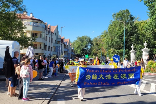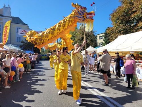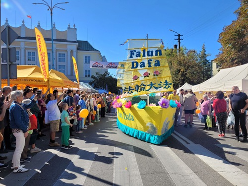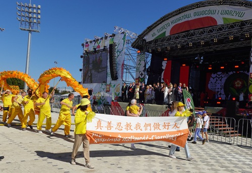 Polish Falun Dafa practitioners have participated in the Harvest Festival parade for many years. This year, their colorful flower float and traditional Chinese golden dragons was once again a popular feature in the parade, and they were greeted with applause. A mother and her son on the float demonstrated the Falun Dafa exercises, accompanied by music. A practitioner beside the float used a loudspeaker to introduce the exercises to the public. On both sides of the float, practitioners distributed leaflets to spectators. The banners worded in both Chinese and Polish conveyed the messages: “Falun Dafa Is Good,” “Truthfulness, Compassion, and Forbearance Make Us Good People,” “Falun Dafa Is Practiced Around the World,” and “Falun Dafa in Poland.” The golden dragon interacted with the audience to their surprise and delight.