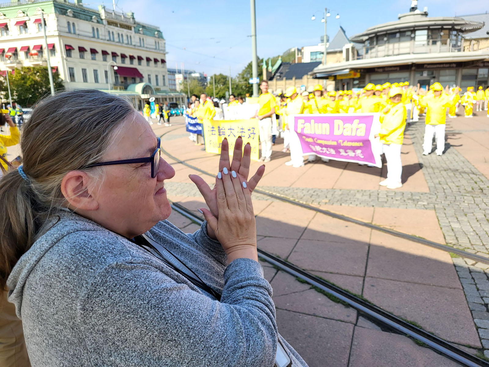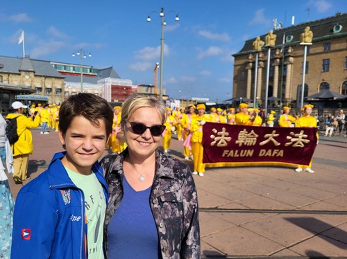 Andrea from Romania has lived in Sweden for 30 years. She made a video recording of the performances and told her son to clap for the practitioners. She supported Falun Dafa’s values.