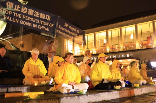 (Minghui.org) Falun Dafa (Falun Gong) practitioners held a candlelight vigil and practiced the exercises together at Gustaf Adolfs Torg in Gothenburg, Sweden, on September 19, 2025.