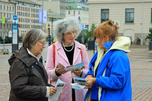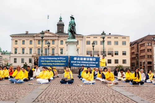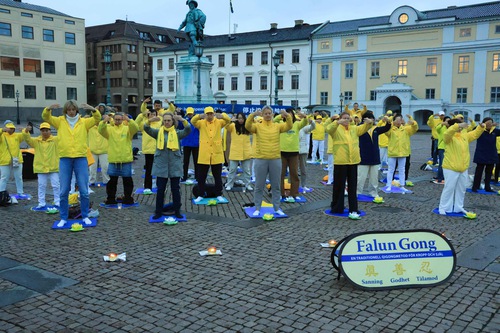 The following day, after a holding a rally and parade, Falun Gong practitioners went to Götaplatsen Square and held another candlelight vigil, on September 20. Many people coming out of a concert hall on the west side of the square saw the practitioners calmly practicing the exercises and meditating in the rain, and either accepted materials or had long conversations with the practitioners to learn more.