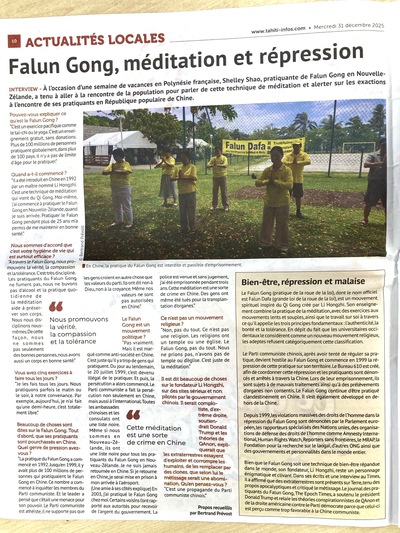 Tahiti Infos is the largest local print and online media. Prevost, the editor-in-chief, decided to interview practitioners. In its final issue of 2025, the newspaper published a full-page, comprehensive report on Falun Gong titled: “Falun Gong, Meditation, and the Repression.” Prevost said, “As a media, we are doing what we should do.”