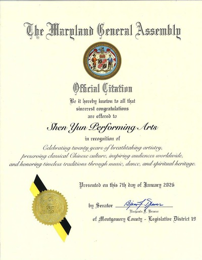 Maryland State Senator Issues Citation Congratulating Shen Yun Performing Arts