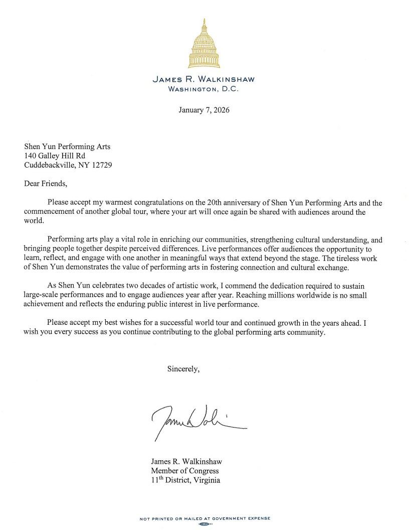 (Minghui.org) US Congressman James Walkinshaw representing Virginia wrote a letter to congratulate Shen Yun Performing Arts group on the 20th anniversary of its founding.