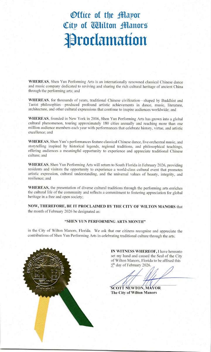 (Minghui.org) To welcome Shen Yun, which is scheduled to perform on February 17 and 18, 2026, Mayor Scott Newton of Wilton Manors, Florida, issued a proclamation on February 5, 2026, designating February "Shen Yun Performing Arts Month" in the city.