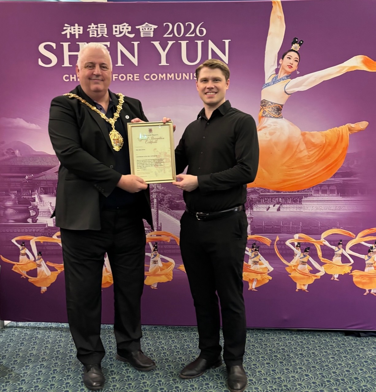 (Minghui.org) Steve Watkins, Lord Mayor of Stoke-on-Trent, attended Shen Yun Performing Arts’ second performance at the Regent Theatre on the afternoon of February 18, 2026. After the performance, Mayor Watkins presented Shen Yun a special Lord Mayor’s Recognition Certificate to honor the company’s outstanding contribution to the city’s cultural life.