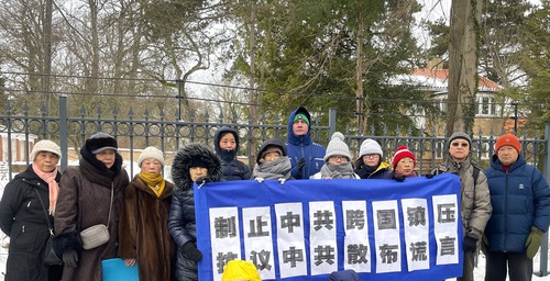 (Minghui.org) Practitioners from Denmark and neighboring countries rallied in front of Copenhagen’s Chinese Embassy on February 16, 2026, to protest the embassy’s smearing and intimidation of Falun Dafa (Falun Gong) and Shen Yun Performing Arts. The embassy had issued a statement on its website to discourage people from watching the world-renowned Shen Yun performance.