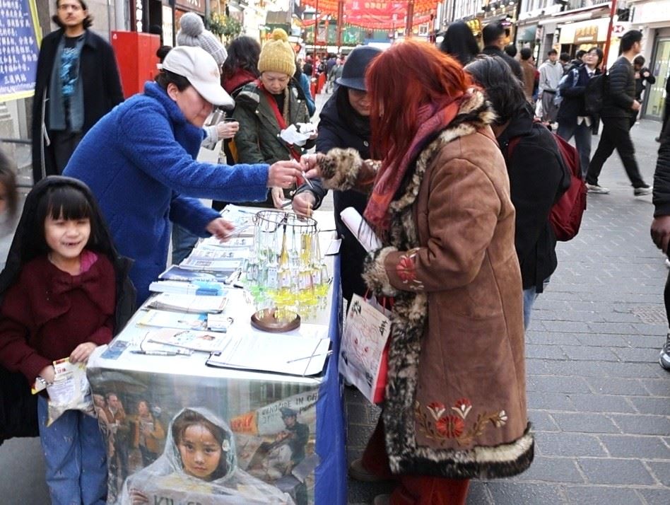 (Minghui.org) The Chinese community held a variety of activities in central London on February 22, 2026, to celebrate Chinese New Year. Falun Dafa practitioners set up a table and put up banners to introduce the practice to the public and raise awareness of the ongoing persecution in China. After they learned about the brutal persecution, many people condemned the Chinese Communist Party’s (CCP) human rights abuses.