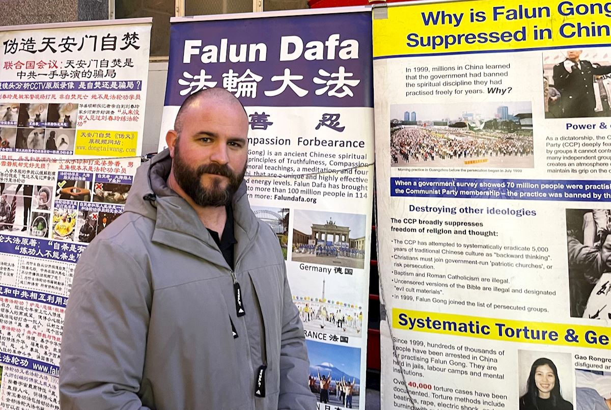 Many people stopped to read the information on the practitioners’ posters and signed the petition, and Jamie was one of them. Jamie worked as a security guard and said his step-mother came from Hong Kong, so every year his family celebrates Chinese New Year.