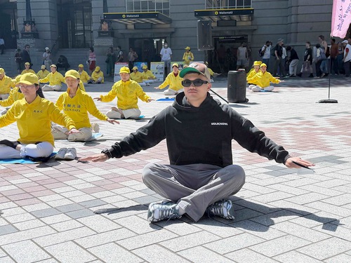 Joe watched as practitioners did the exercises, and he talked with a practitioner. He said he liked to meditate every day and he felt that Falun Dafa was a profound practice.