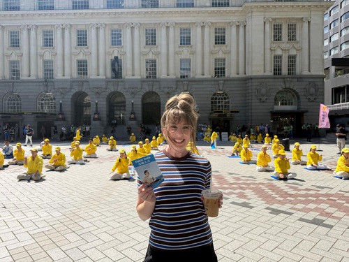Cherie watched the exercises for about half an hour. She said the peaceful scene in the crowded city was impressive. She felt if more people could learn Falun Dafa and the principles of Truthfulness-Compassion-Forbearance, the world would become a better place. This is especially important for the younger generation.