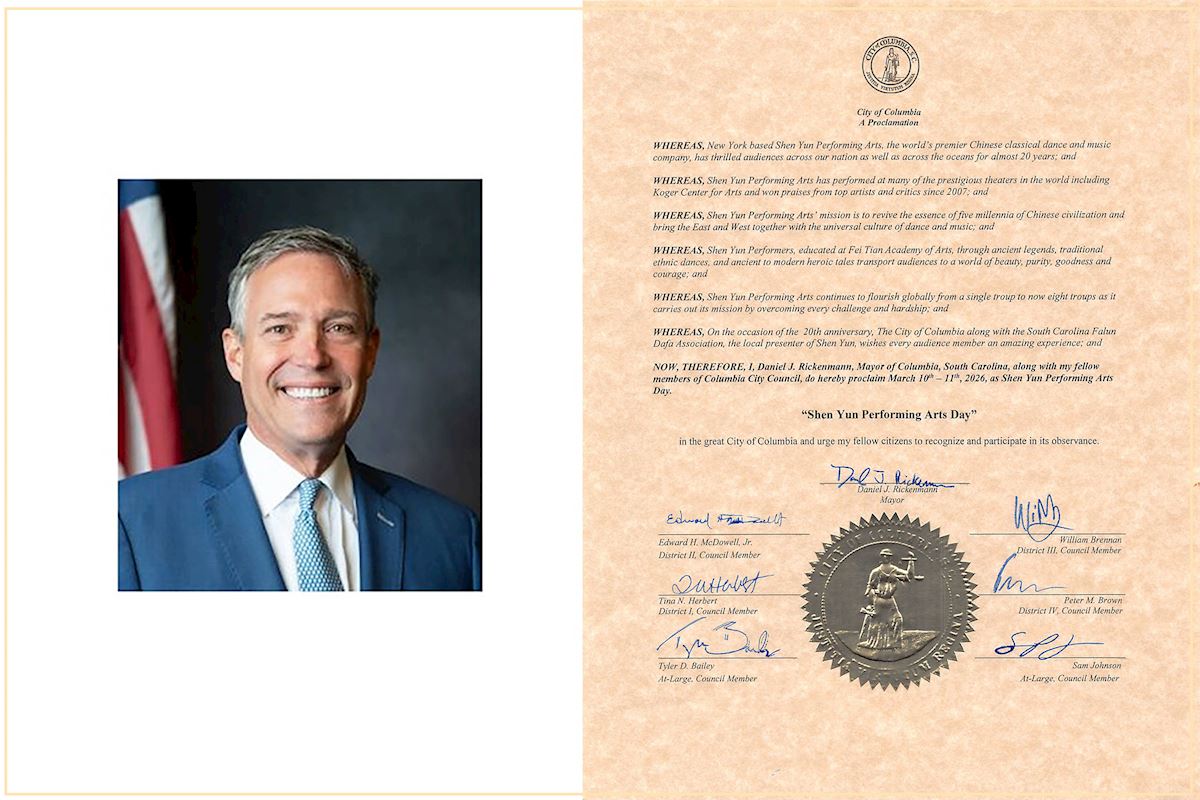 “NOW, THEREFORE, I, Daniel J. Rickenmann, Mayor of Columbia, South Carolina, along with my fellow members of Columbia City Council, do hereby proclaim March 10th – 11th, 2026, as Shen Yun Performing Arts Day.”