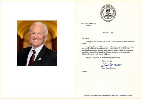In his congratulatory letter, Governor McMaster wrote, “It is my pleasure to welcome you to the 2026 Shen Yun performance in Columbia, South Carolina.