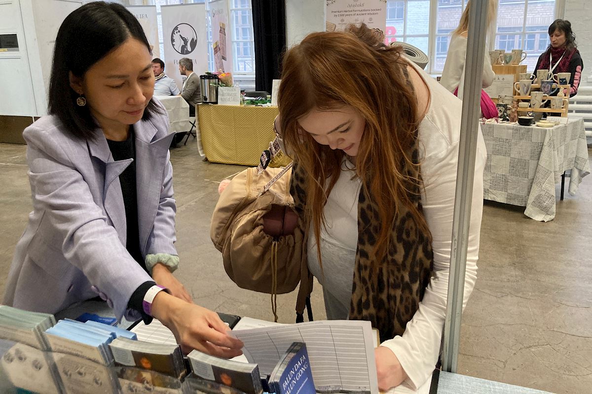 Practitioners introduced Falun Dafa, also known as Falun Gong, and told people how the Chinese Communist Party (CCP) persecutes the spiritual discipline and targets practitioners for forced organ harvesting. Practitioners demonstrated the exercises at their booth, distributed flyers, and collected signatures on a petition to stop the persecution.