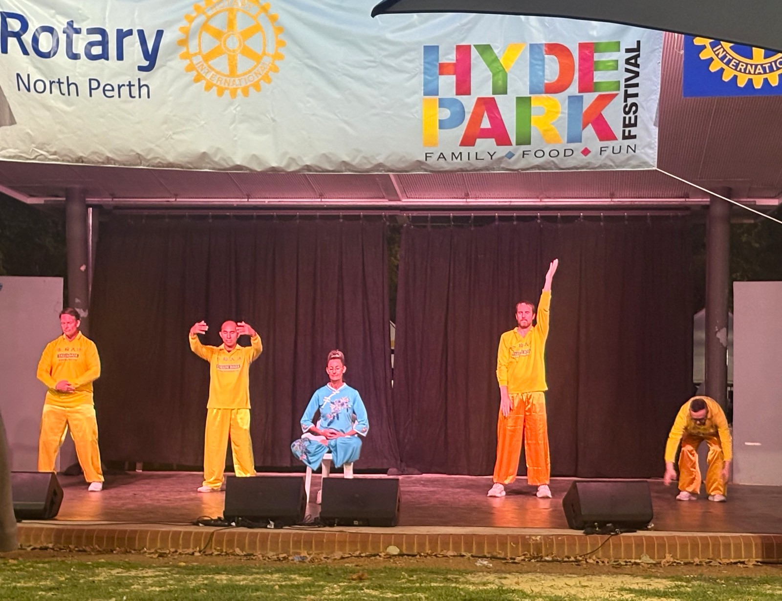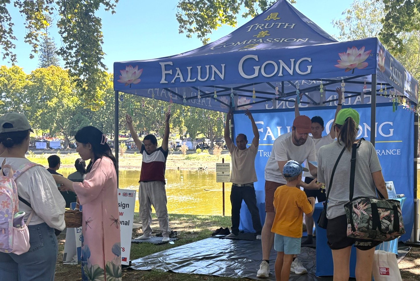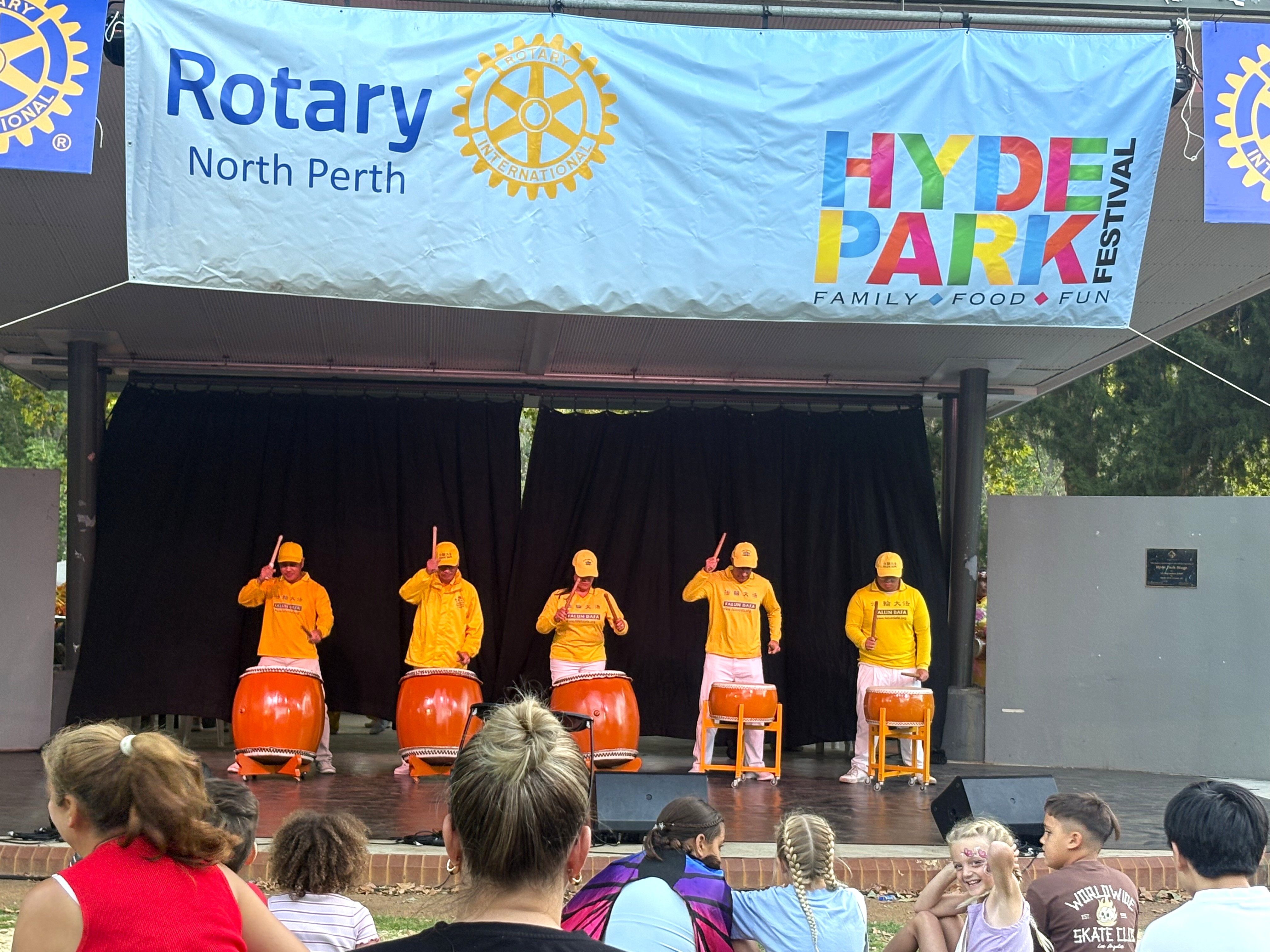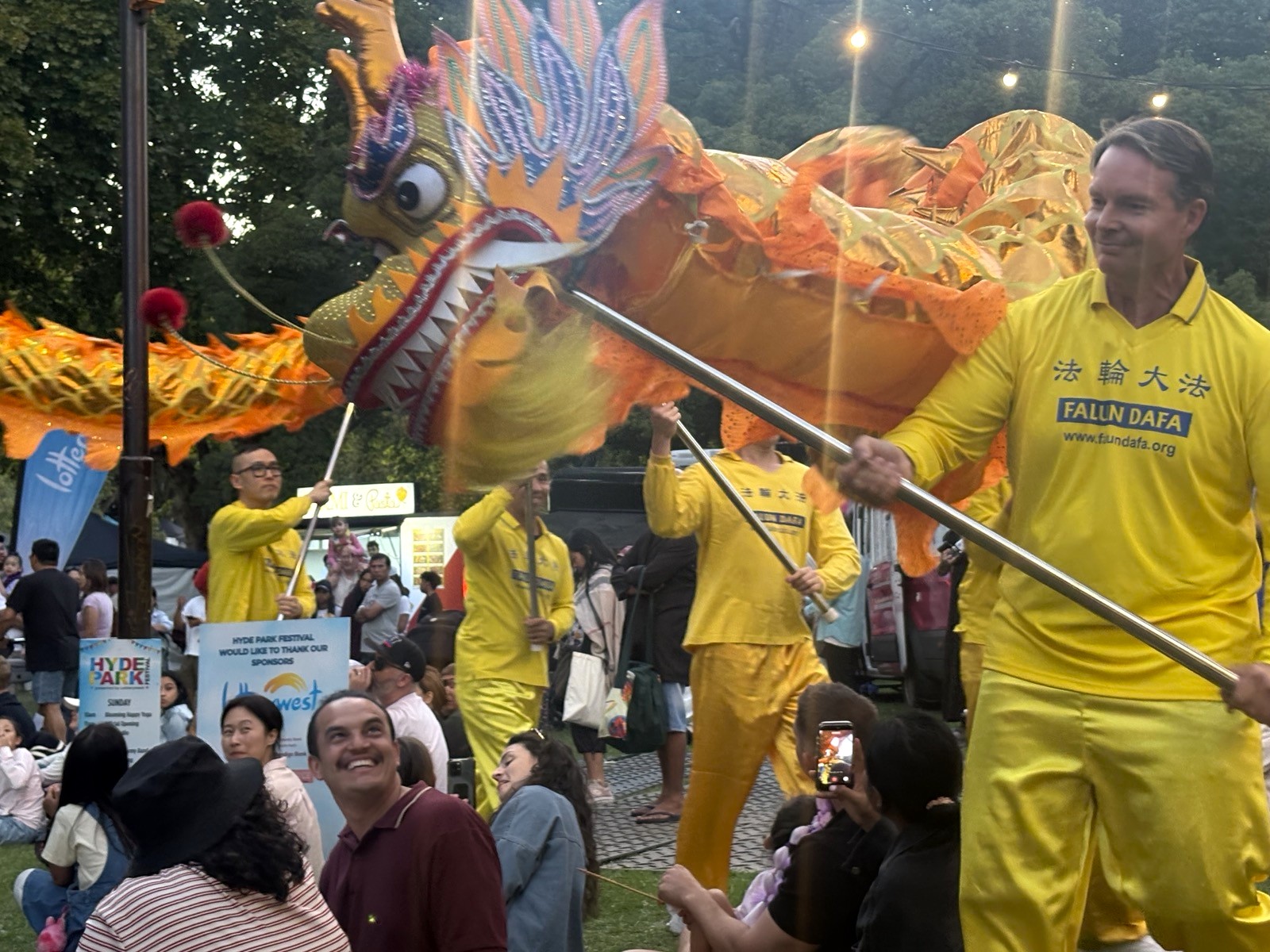 (Minghui.org) The annual Hyde Park Festival was held in Perth, Australia, on March 1 and 2, 2026. Falun Dafa (Falun Gong) practitioners were invited to participate. They introduced the universal values of Truthfulness, Compassion, and Forbearance and raised awareness of the Chinese Communist Party’s (CCP) persecution. They also demonstrated the exercises and  performed a dragon dance, waist drums, and danced on stage.