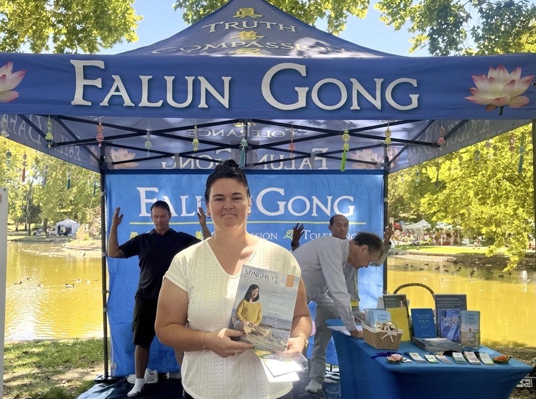 Tegan Green went to the Falun Gong booth and said she wished to learn the practice. She said, “This world needs more Truthfulness, Compassion, and Forbearance.”