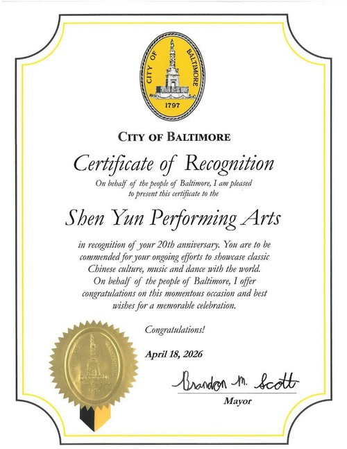 Mayor Brandon M. Scott wrote, “On behalf of the people of Baltimore, I am pleased to present this certificate to the Shen Yun Performing Arts in recognition of your 20th anniversary. You are to be commended for your ongoing efforts to showcase classic Chinese culture, music and dance with the world. On behalf of the people of Baltimore, I offer congratulations on this momentous occasion and best wishes for a memorable celebration.”