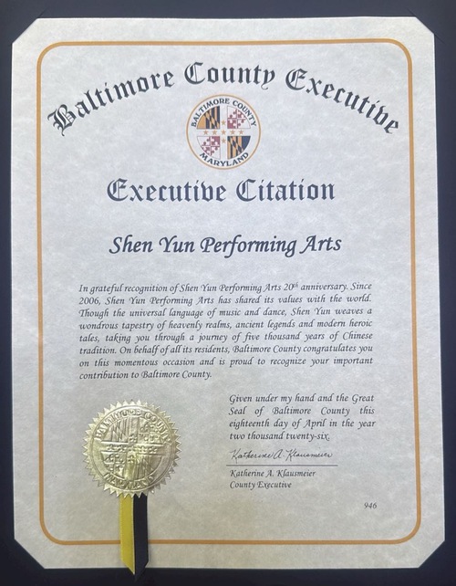 County Executive Katherine A. Klausmeier wrote, “In grateful recognition of Shen Yun Performing Arts 20th anniversary. Since 2006, Shen Yun Performing Arts has shared its values with the world. Though the universal language of music and dance, Shen Yun weaves a wondrous tapestry of heavenly realms, ancient legends and modern heroic tales, taking you through a journey of five thousand years of Chinese tradition. On behalf of all its residents, Baltimore County congratulates you on this momentous occasion and is proud to recognize your important contribution to Baltimore County.”