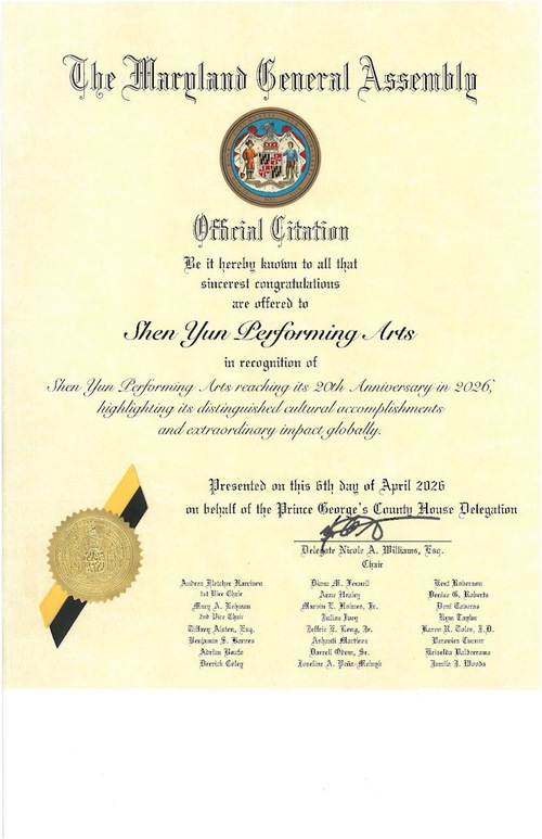 The citation was dated April 18, the first day of Shen Yun’s performances in Baltimore. The citation was also signed by Lieutenant Governor Aruna Miller and Secretary of State Susan C. Lee.