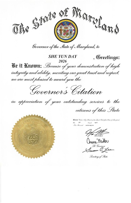 The citation reads, “Governor of the State of Maryland, to SHEN YUN DAY 2026, Greetings: