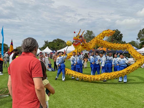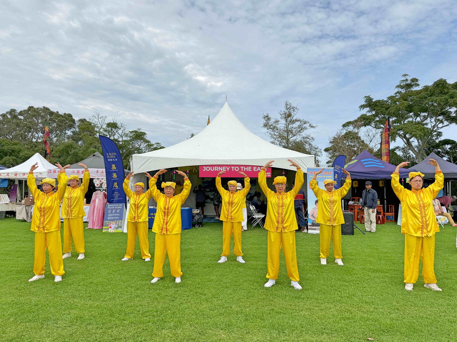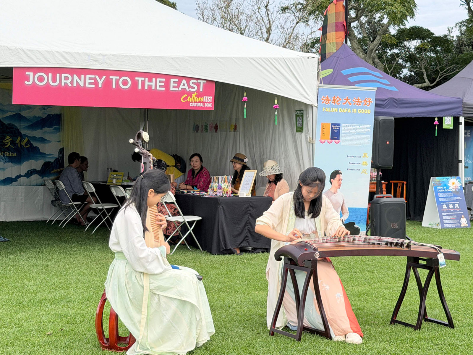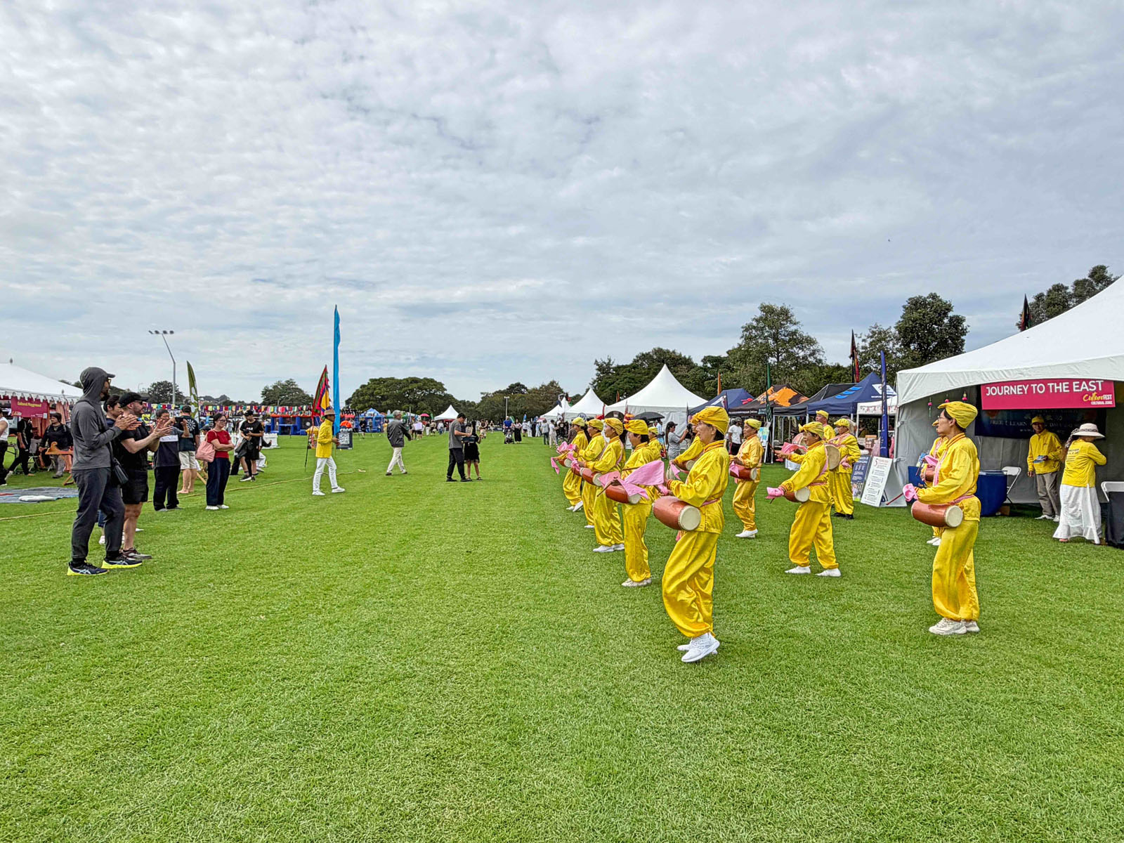 (Minghui.org) Falun Dafa practitioners participated in Culture Fest 2026 in Auckland, New Zealand on March 29, 2026. They had a booth where they introduced Falun Dafa (also known as Falun Gong) and demonstrated the Falun Gong exercises. Many people paused to watch the exercise demonstration and quite a few even tried them. Practitioners also performed on waist drums, presented a lively dragon dance, and performed on the guzheng and pipa, traditional Chinese musical instruments. Many festival attendees remarked that the practitioners were a joyful addition to the festival.