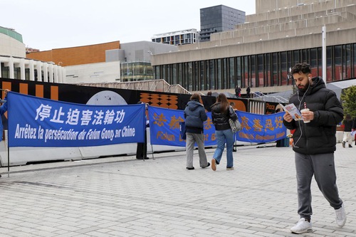 Practitioners held banners near Place des Festivals, containing messages such as “Falun Dafa is Good,” “Truthfulness-Compassion-Forbearance is Good,” “The World Needs Truthfulness-Compassion-Forbearance,” “Stop the CCP’s Organ Harvesting from Living Practitioners,” “Stop the CCP’s Transnational Repression,” and “Only by Disintegrating the CCP can the Persecution be Stopped.” The eye-catching messages and peaceful scene attracted people’s attention.