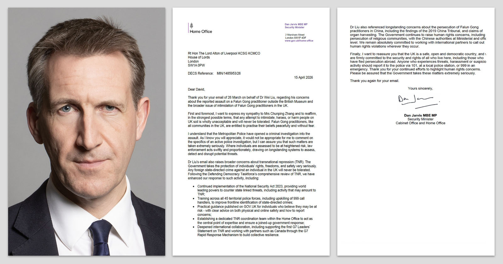 (Minghui.org) Dan Jarvis, the UK Minister of State for Security, sent a written response to Lord Alton, a member of the House of Lords, on April 15, 2026, regarding an incident in which a Falun Gong practitioner was attacked by a bus driver who is pro-CCP (Chinese Communist Party) at a site outside the British Museum where practitioners tell people about the persecution in China. Several Members of Parliament (MP) condemned the attack and the CCP’s transnational repression.