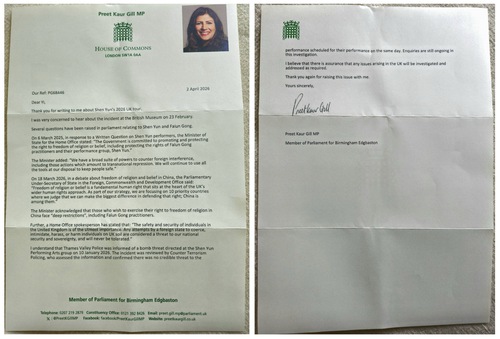 Preet Kaur Gill MP wrote: “I was very concerned to hear about the incident at the British Museum on 23 February. Several questions have been raised in Parliament relating to Shen Yun and Falun Gong.
