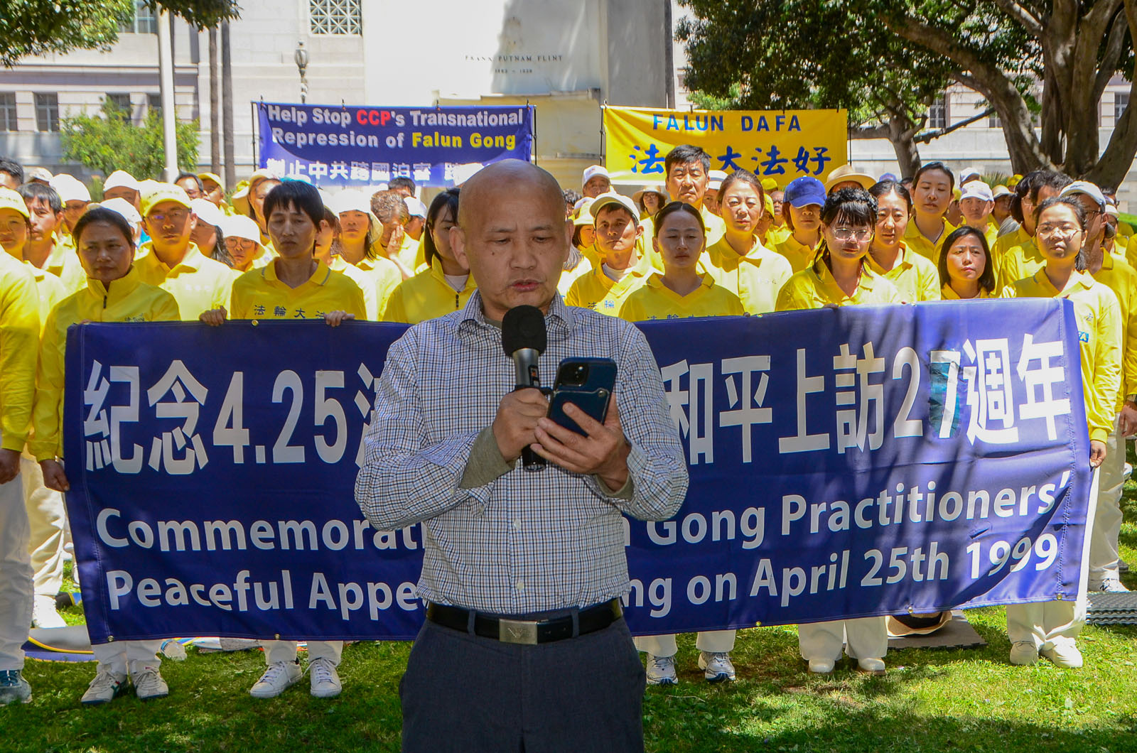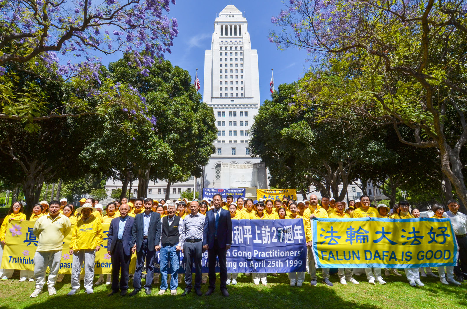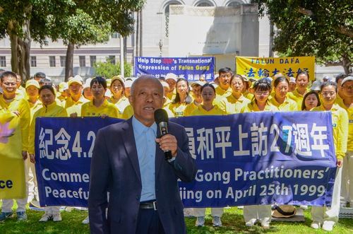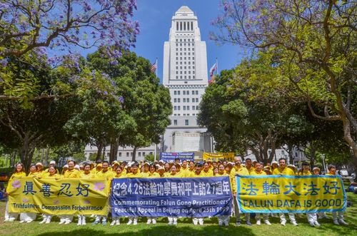 (Minghui.org) To mark the 27th anniversary of the April 25 appeal in Beijing, Falun Dafa practitioners held a rally in front of the Los Angeles City Hall on April 23, 2026. They called on people to help stop the Chinese Communist Party’s (CCP) 27-year-long persecution of this peaceful mind-body cultivation practice.