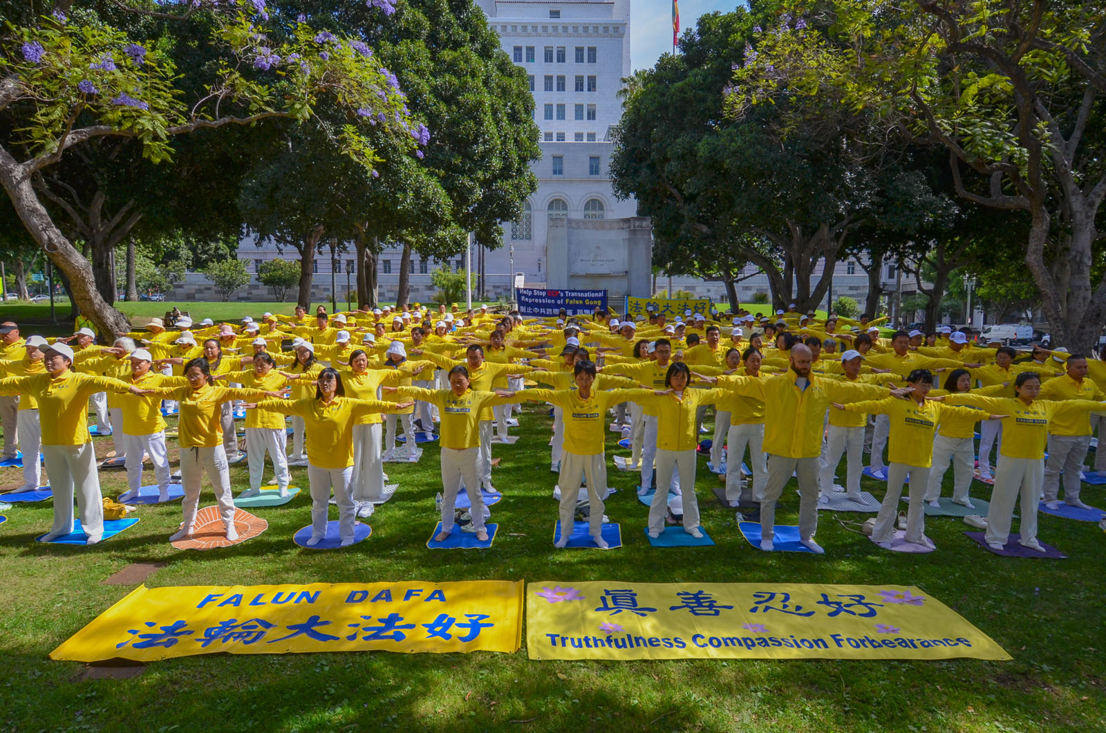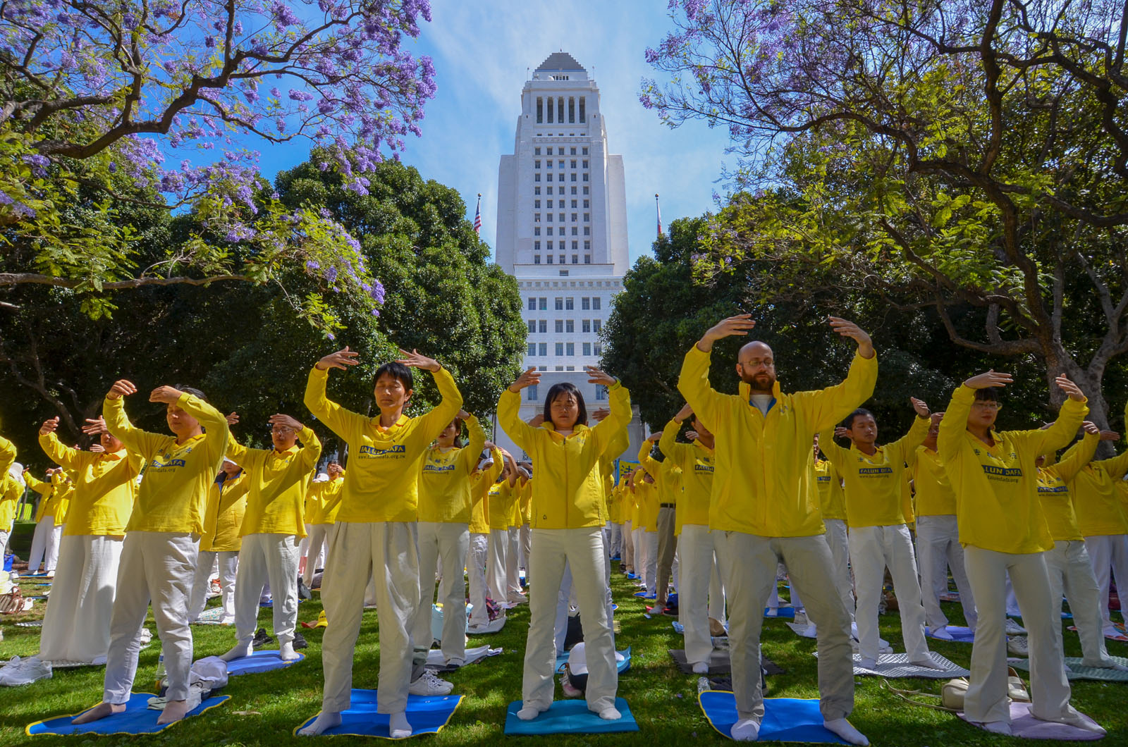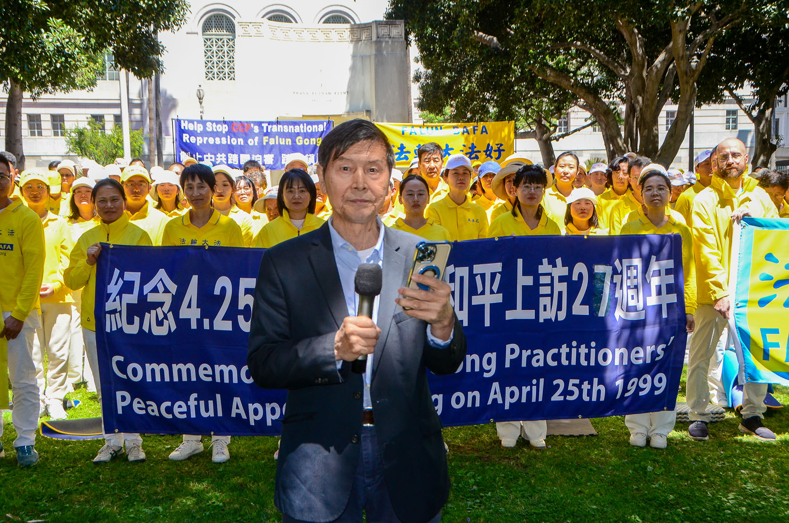(Minghui.org) To mark the 27th anniversary of the April 25 appeal in Beijing, Falun Dafa practitioners held a rally in front of the Los Angeles City Hall on April 23, 2026. They called on people to help stop the Chinese Communist Party’s (CCP) 27-year-long persecution of this peaceful mind-body cultivation practice.