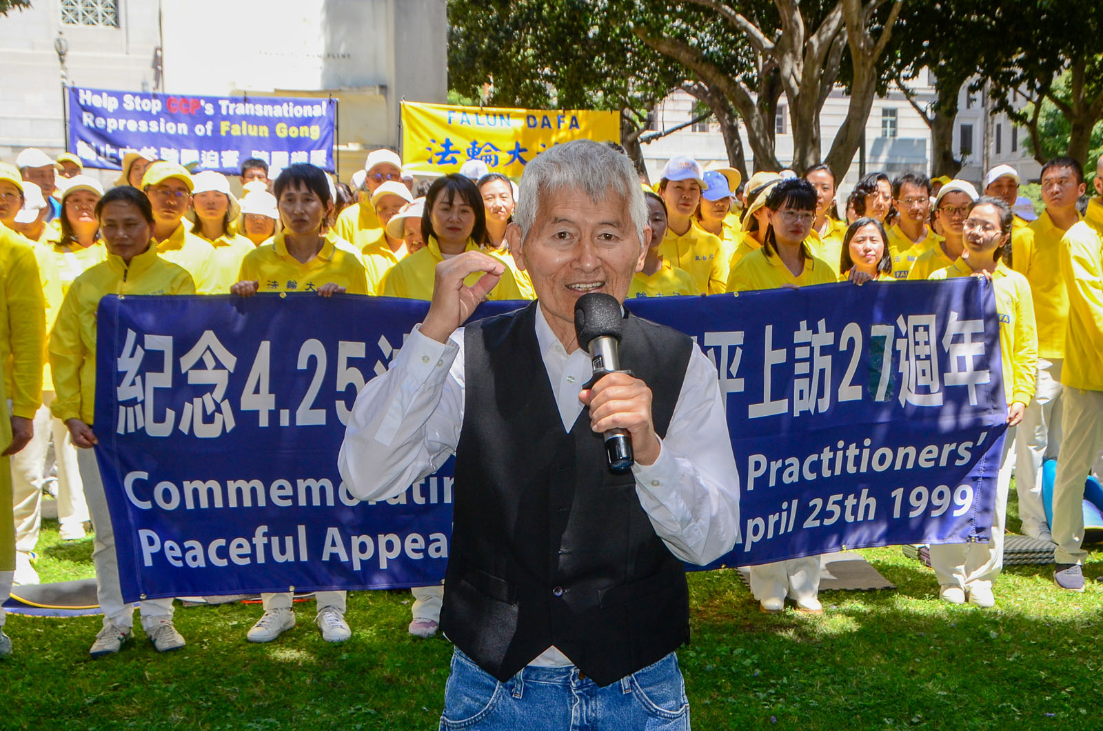 Professor Wu Yingnian, spokesperson for the Los Angeles Falun Dafa Association, briefly introduced the background of the April 25 appeal in Beijing. He said that practitioners went to Beijing to request the release of more than 40 practitioners who were arrested in Tianjian, a city 60 miles east of Beijing.