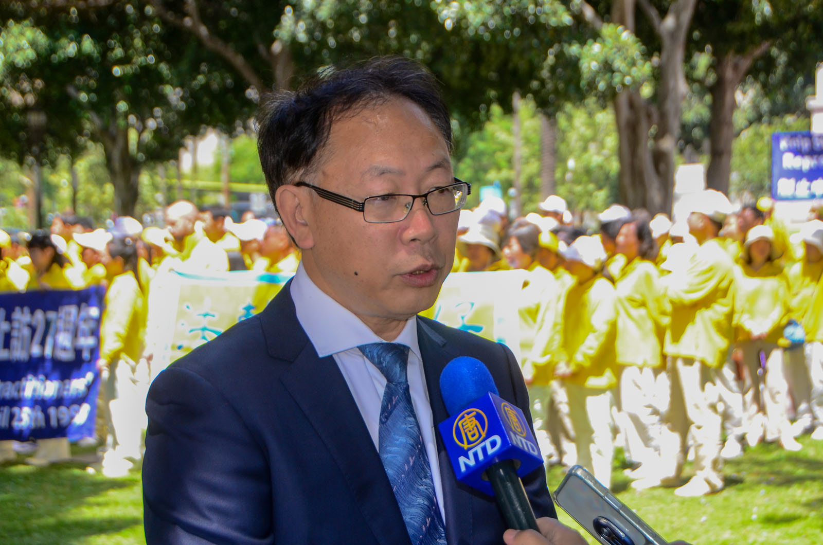 Former Chinese Human Rights Lawyer You Feizhu being interviewed in the rally (The Epoch Times)