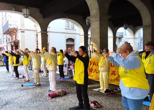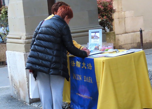 The seat of the Grand Council of Geneva is a famous tourist attraction in Geneva, so many visitors watched practitioners do the exercises and read the information. Many of them signed the petition to express their support for practitioners’ efforts to end the persecution.