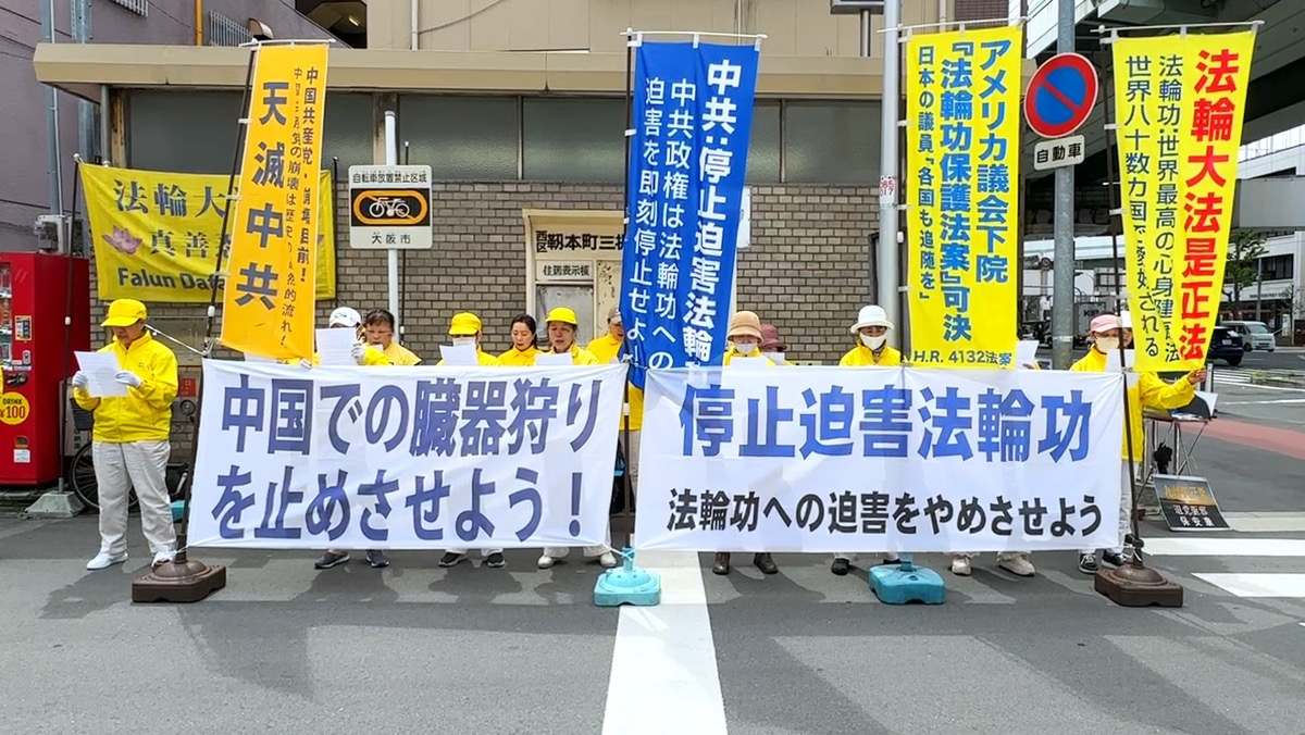 Practitioners from the Kansai region gathered in front of the Chinese Consulate in Osaka on April 21. They displayed banners and called on the CCP to immediately stop the persecution of Falun Gong and stop harvesting organs from living practitioners.