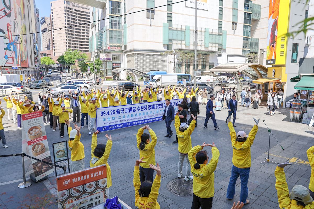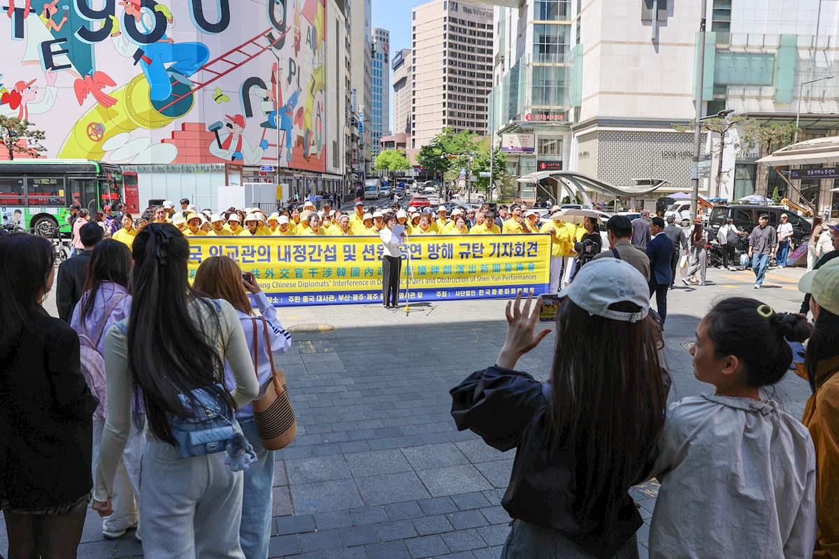 (Minghui.org) The South Korean Falun Dafa Association held press conferences in front of the Chinese Embassy in Seoul and the Chinese Consulates in Busan, Gwangju, and Jeju on April 24, 2026. They commemorated the 27th anniversary of the April 25 appeal in Beijing and protested Chinese diplomats’ interfering with South Korea’s internal affairs and interfering with Shen Yun performances.