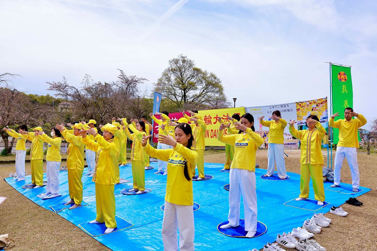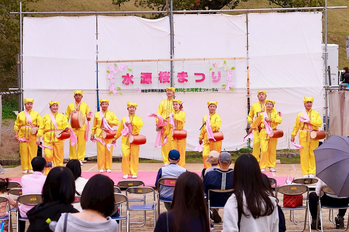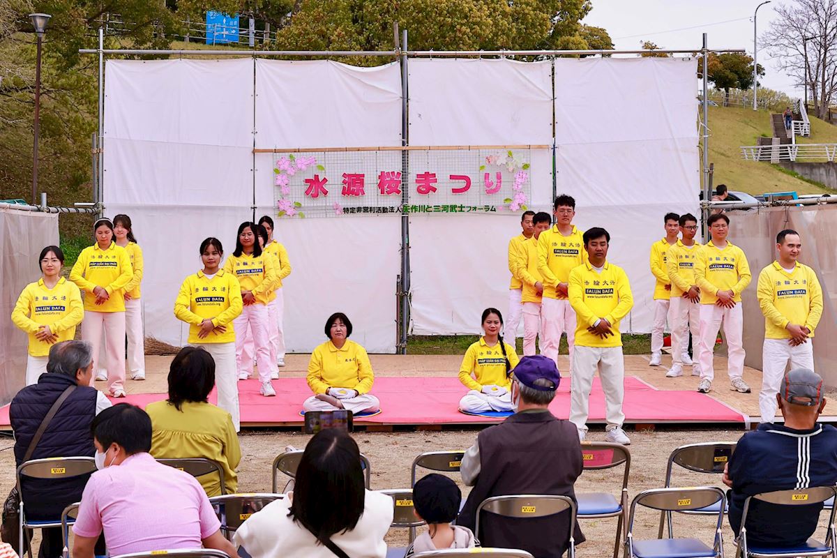 (Minghui.org) Practitioners in Aichi Prefecture participated in the 32nd Suigen Cherry Blossom Festival in Toyota City on April 4-5, 2026. In addition to demonstrating the exercises, practitioners also presented a waist drum performance and distributed information to introduce the practice to local residents and tourists.