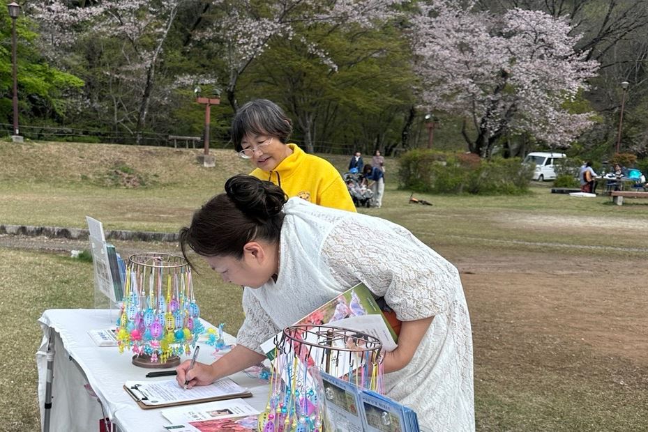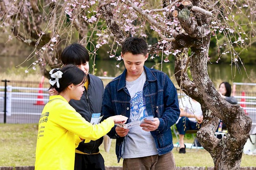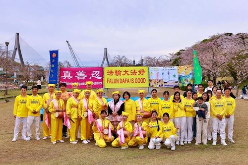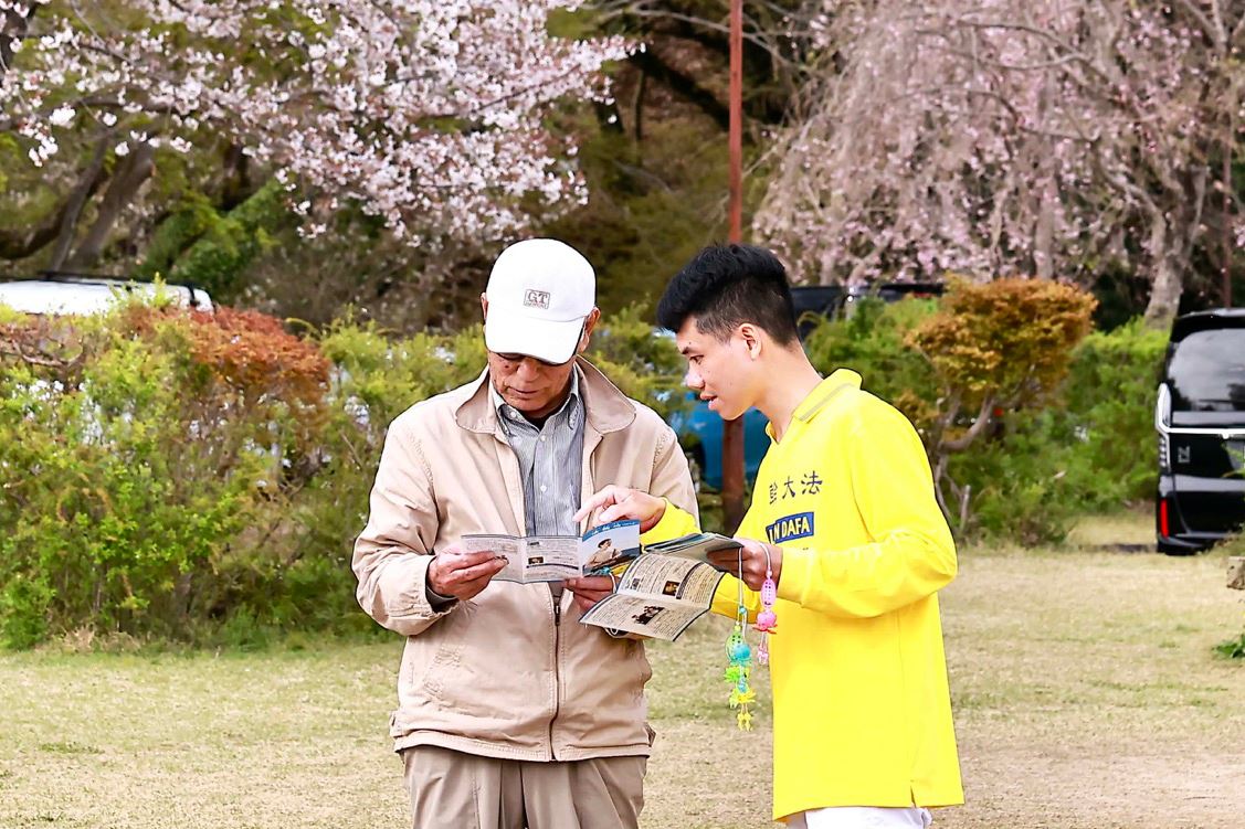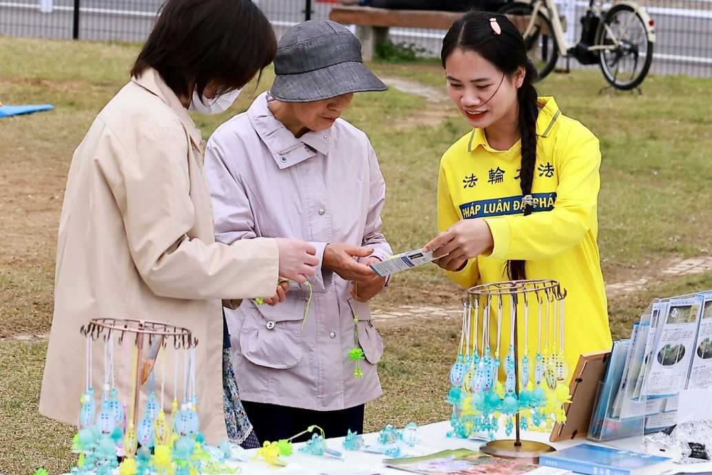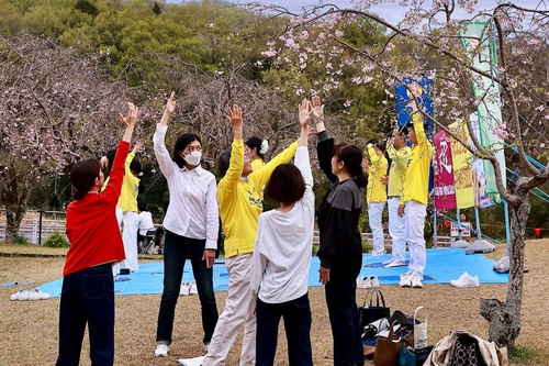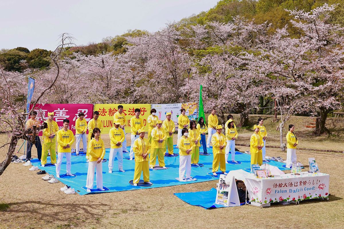 (Minghui.org) Practitioners in Aichi Prefecture participated in the 32nd Suigen Cherry Blossom Festival in Toyota City on April 4-5, 2026. In addition to demonstrating the exercises, practitioners also presented a waist drum performance and distributed information to introduce the practice to local residents and tourists.