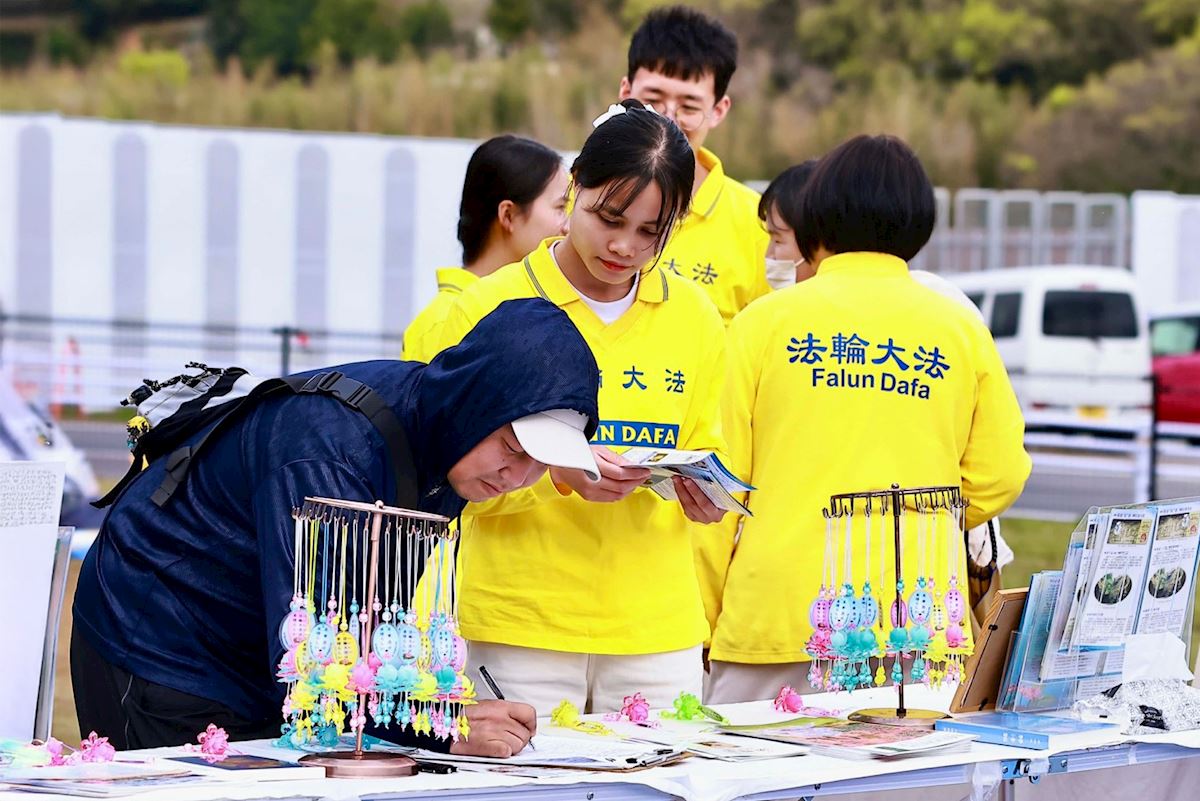 Ms. Mizuno, who'd met practitioners the day before, brought by vouchers for tea and refreshments the next morning, and invited them to her tea booth. After learning about Falun Dafa and the harsh persecution in China, she signed a petition calling to end the forced organ harvesting by the CCP.